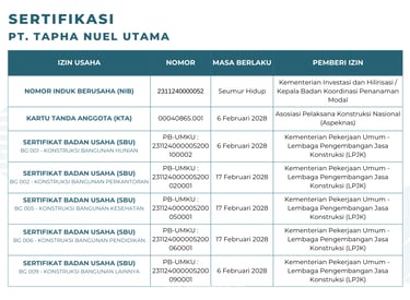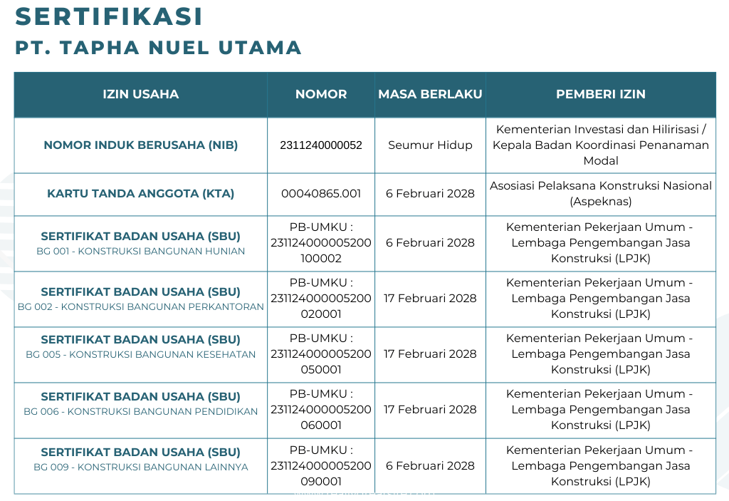 Kontraktorfacade.com dikelola oleh PT. Tapha Nuel Utama Yang Sudah Memiliki Perizinan Resmi Yang Dikeluarkan Oleh Pemerintah Republik Indonesia dan Terdaftar Sebagai Anggota Pada Asosiasi Pelaksana Konstruksi Nasional (ASPEKNAS).